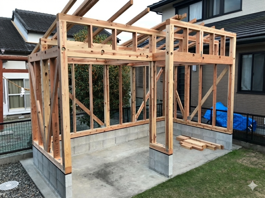 当社の木材プレカット加工材を使用し、個人のお客様がDIYで施工された事例をご紹介します。 工場で正確に加工された部材を、土台 → 柱 → 梁 → 母屋 → 屋根の順に組み立てることで、現場加工をほとんど行わず、スムーズに施工が進みました。 お客様からは「...